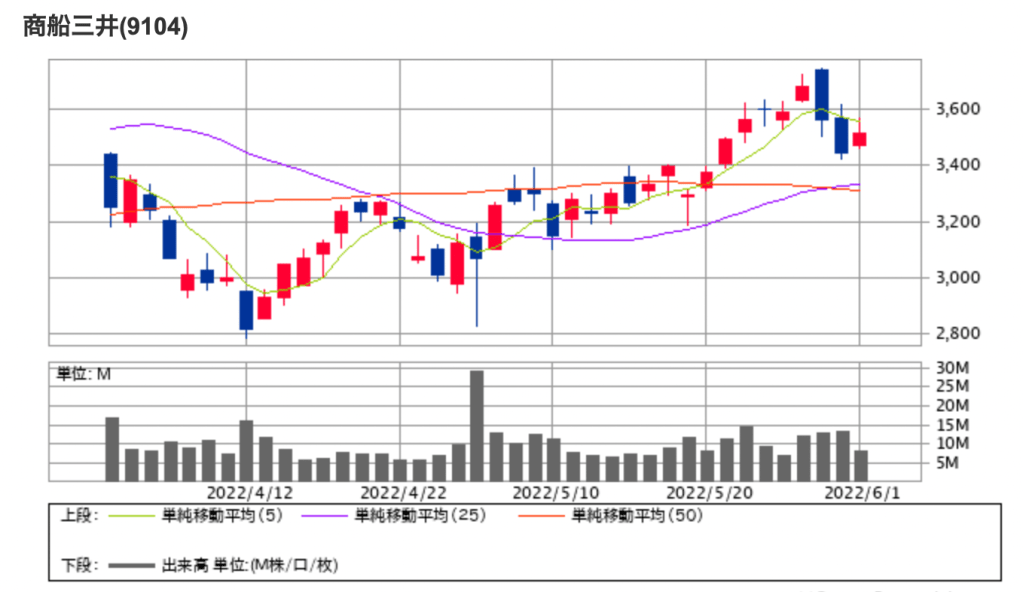 2022年5月は、商船三井が下がり始めたところで利益確定しました。