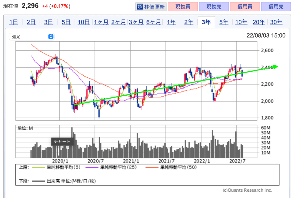 ただ長期的(3年スパン)で見ると右肩上がりの銘柄ではあるので、下がるようであれば底を打つまでは静観し、上がるようであれば買い戻しても良いかもしれませんね。