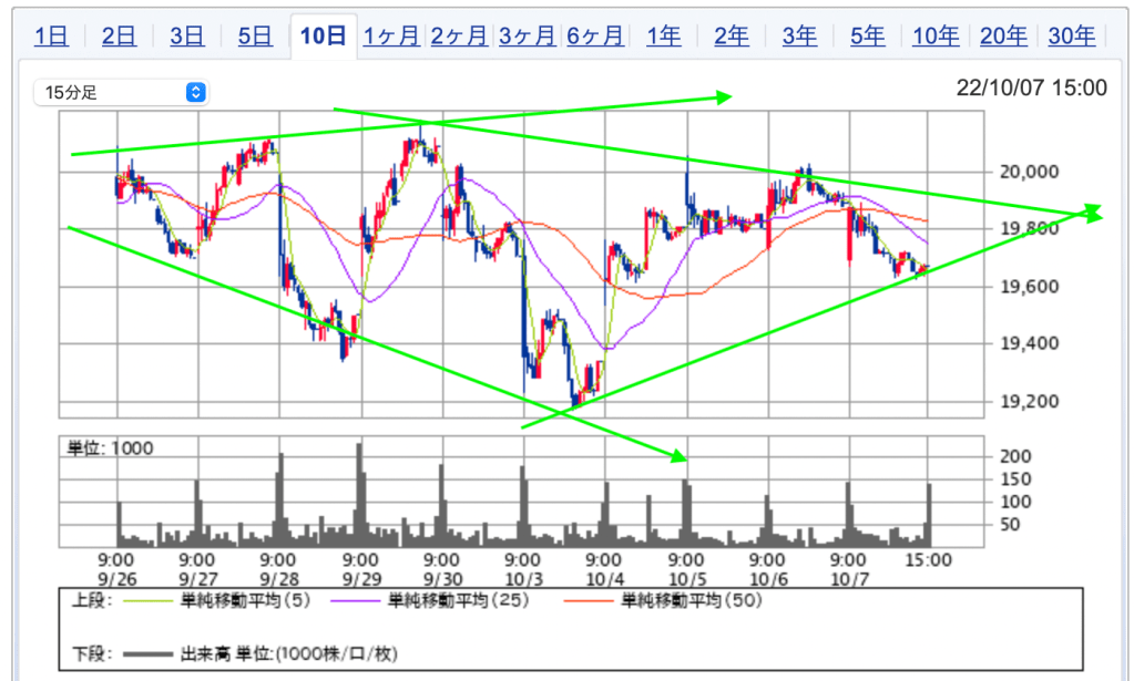 - 近々は、20,000円から19,500円の間で推移。近々のトレンドで見ると20,000円から19,600円の範囲に見えますが。(3ヶ月と10日のチャートから)