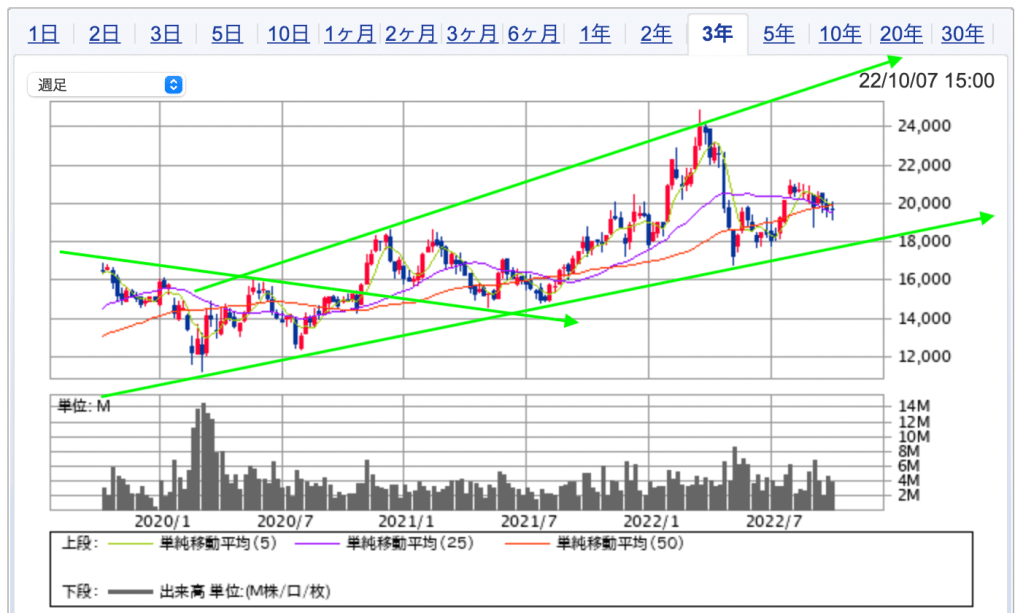 - 振れは、18,000円から上は22,000円。(3年間及び6ヶ月のチャートから)