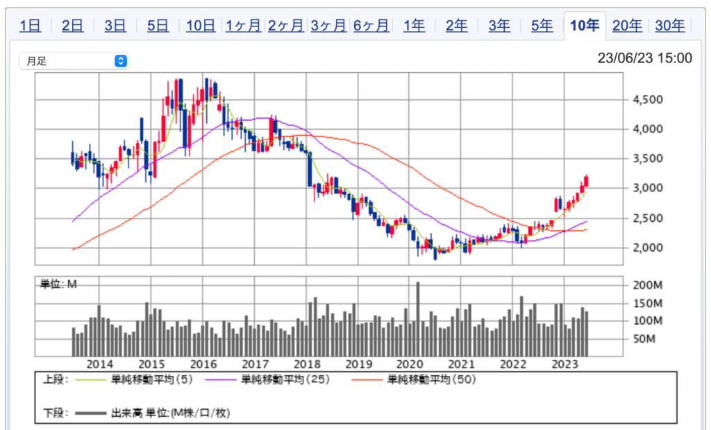 2020年6月に2,000円をマークしてから、1,000円以上も値上がりしており、完全に上昇傾向に入っているようにも見えます。(取引量も十分)