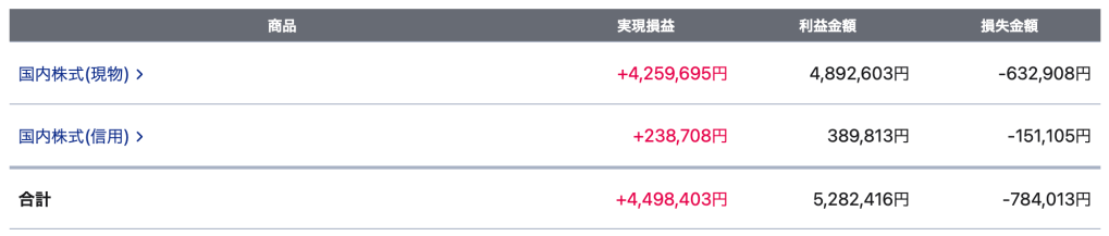 現物取引の実益が4,259,695円、信用取引が238,708円、合計4,498,403円でした。