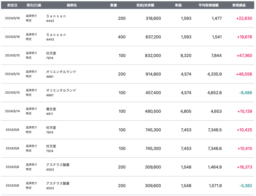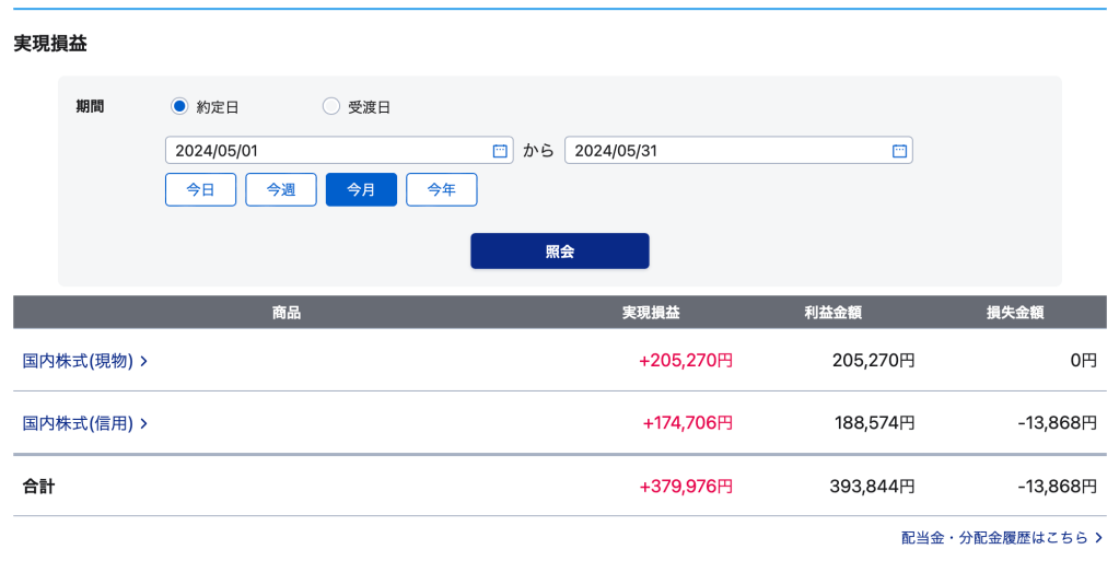5月は、現物の一部を処理したこともあり、信用の部とも合わせて+379,976円のパフォーマンスとなりました。