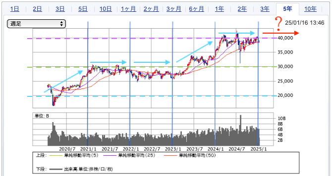 逆に50,000円台へ突入する際に勢い良く(1年間)上がる可能性があるのでそれまでは、銘柄を絞って取引するのが良いかもしれない。